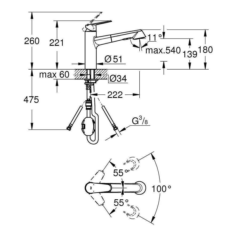 medium spout monobloc installation GROHE LongLife finish GROHE SilkMove 35 mm ceramic cartridge Pull-Out spray for greater flexibility Dual Spray - switch between laminar spray and shower jet automatic return to mousseur adjustable flow rate limiter swivel cast spout, swivel area 100° protected against backflow flexible connection hoses rapid installation system maximum flow rate (at 3 bar): 11 l/min